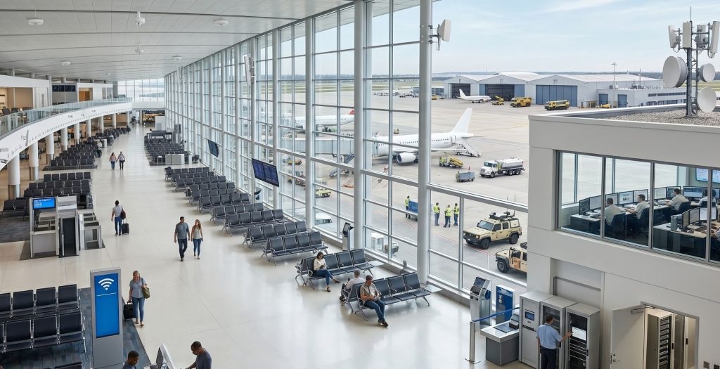 Applications: Cellular network coverage in airport terminals; communication systems in operational areas and supporting facilities; high-reliability indoor networks for public and restricted areas.